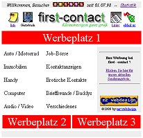 Werbepreisliste Sie m�chten mehr Besucher auf Ihrer Internetseite? Nichts einfacher als das! Kosteng�nstig k�nnen Sie bei uns Werbebanner einblenden. Die aktuellen Besucherzahlen von first-contact k�nnen Sie hier ablesen: Unabh�ngige Statistik