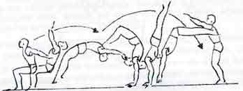 Genellikle ayakta veya kartvilden sonra yapılır. Şıçramadan önce dizlerde bir bükülme ve kalçada bir alçalma yapılırken, kollar aşağdan öne kaldırılır. Haraket yapılırken gövde mutlaka dik tutulmalı, alçalma üst bacak yere paralel olacak şekilde olamalıdır. Sıçrama anında başın ve gövdenin geriye alınmasıyla birlikte kollar arka – yukarı savrulur. Kollar mindere dayandığında, bütün vücut tam bir gerginlik içindedir. Alıştırmacının, amuda çıktığında bükülü bacakla ellere doğru yaptığı bir vuruş hareketini, gergin kollarla yapılan itme hareketi izler.
