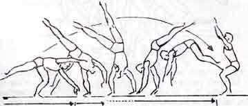 Harekete giriş bölümü çember dönüşünün aynıdır. Dönme anında bacaklar birleştirilir. Başlangıçta çember dönüşünde olduğu gibi kollar üzerinde bir an amutta kalan vücut 90 derece daha vertikal eksende dödürülür. Bacaklar mindere dokunmadan kollarla çok kuvvetli olarak itme yapılır. Ayağa kalkışta bacaklar bükülü veya gergin olabilir. Bu kendisinden sonra yapılacak harekete göre değişir.
