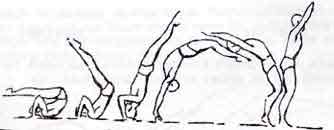 Ayakta duruştan gövdenin öne eğilmesini, ellerin omuz genişliğinde mindere koyması izler. Bacaklar gergin ve bitşiktir. Baş göğüse çekilerek ense yere konur ve bacaklarda hiçbir hareket yapılmadan kipe vaziyetine yuvarlanır. Gövde ağırlığı ense ve kollar üzerindedir. Öne yuvarlanmayı bacakların kuvvetli olarak öne-yukarı kipe vuruşu ve ellerle yeri itme iyi bir zamanlandırma içinde takip eder. Baş enseye alınır. Kısa bir uçma devresinden sonra kollar yukarıda, gergin bacakla ayağa kalkılır. Hareketin en önemli noktası zamanlamadır.