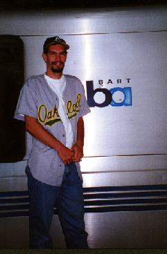 This is me waiting for a BART train to go to an Oakland A's game in August 1998.