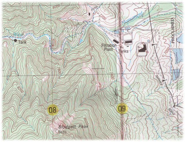 | We continued on Trail 713, heading southwesterly and admired Blodgett Peak again. Hiking deeper into the water treatment facility grounds, the trail turned west and then south and passed the east side of the Tesla Hydroelectric Plant. The trail followed a paved road downwards (how we dreaded losing the little elevation we had gained already!) and then met with Monument Creek. At a fence blocking us from taking the washed out Aqueduct, we hiked up a steep and rocky incline westward. The steep incline seemed to go on forever. Just when you thought it might level off, it didn't. When it eventually did level off, we walked through the shade of many pine trees and the coolness quickly dried the sweat we had accumulated during the steep climb. Finally, the trail met with the Aqueduct that ran along Monument Creek. We stayed on the Aqueduct until we came across a large water holding tank. At this point we left Trail 713 and turned south across a short footbridge and on to Blodgett Peak. We could have stayed on the Aqueduct and hiked to Northfield Reservior and Rampart Reservior beyond that. We'll leave those for another day. |