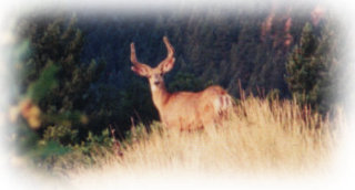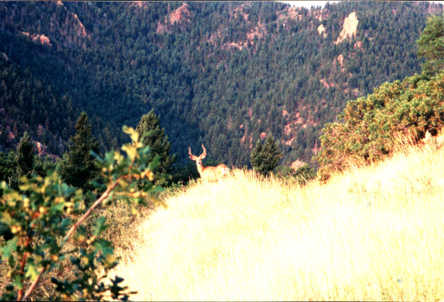 Silhouetted by the backdrop of Blodgett Peak was a buck muledeer and three young females. The females quickly bounded off when we happened upon them, but the young buck stood and stared at us. He posed for a while, allowing Scott to snap a couple pictures, one with Blodgett in the background (shown above) and a closer shot (shown to the left). We stood for about a minute staring at each other before he too bounded off in the brush never to be seen by us again. |