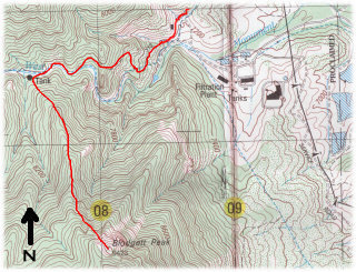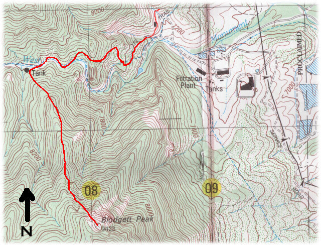 Topo map of Blodgett Peak Area![]() Topo map with trail to Blodgett Peak marked ![]() |