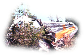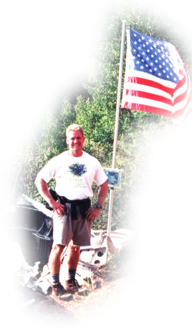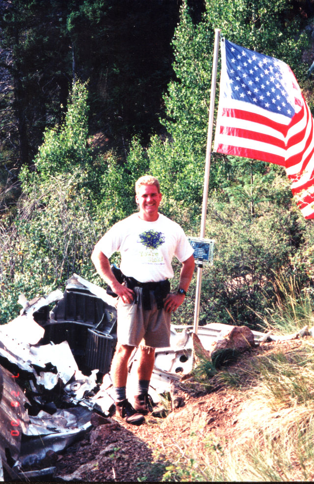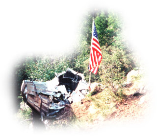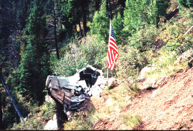 | On Feb 23rd, 1943, a twin-engined transport known as a C-49J was enroute from Pueblo to Denver. The pilot and two crewmen were flying in overcast weather. The plane crashed at 1205 hours local time, killing the entire crew. The official record from the War Department offers no explanation for the crash. The reason for the crash was listed as Collision - Other Object. A US Flag and small placard were placed at the portion of wreckage highest on the slope in 1999. As we got closer, we saw that the memorial had been placed by the ALS Class of 1999. This was an appropriate memorial for a crew that was almost forgotten in a crash that happened during a time when our country was involved in a spectacular struggle for the fate of the world. Looking on the small memorial, we realized the effort the creators had put forth to get the flag and placard up here. It was tough climb without a flag and placard! The flag has faded a bit from months in the bright Colorado sun, and the placard is a bit weather-worn, but it is a fitting tribute to our fallen comrades. |