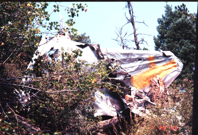 We climbed down the scree of the mountain-side to get a closer look at the wreckage. Looking up, we saw a large yellow cross painted on what appeared to be the vertical tail of the plane. We explored a bit, being careful not to disturb the wreckage. It was tough climbing back up the scree, but there were enough roots and trees to allow us to get back to the ridge without too much trouble. Once on the ridge, we had another steep slope to climb! This was getting ridiculous, but the end was in sight and we knew it. We had to go over another large group of rocks before another steep slope and the final scramble over boulders to the top of Blodgett Peak. |