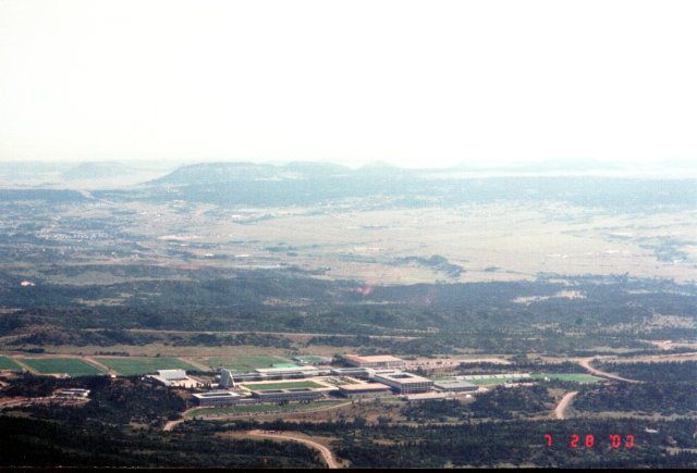 | When we finally reached the top, we realized the sweat and heavy breathing to reach this was all worth it! My what views. The first view to greet us was when we looked back to see the Cadet Area of the Air Force Academy below us. It was easy to pick out the distinctive Cadet Chapel. |