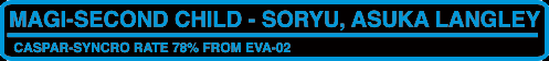 Asuka Langley Soryu- Second Child to be founded by the Marduk report; designated pilot of Evangelion EVA-02; 1/4 Japanese, 3/4 German; fluent in Japanese, German, and English; graduated college at 14. Asuka originally began her EVA training in Germany. After being chosen as the second child, she went to tell her mother and found that she had hung herself- a result of the mental breakdown she had ocured when testing the EVA. |