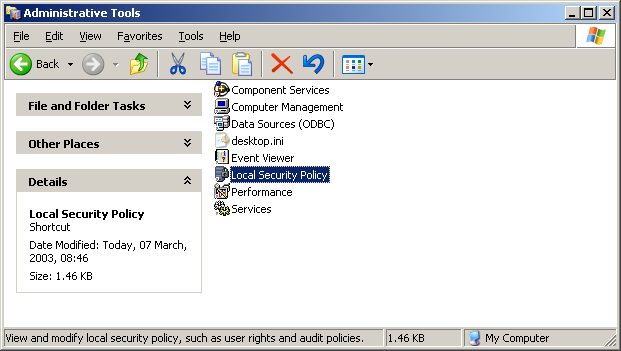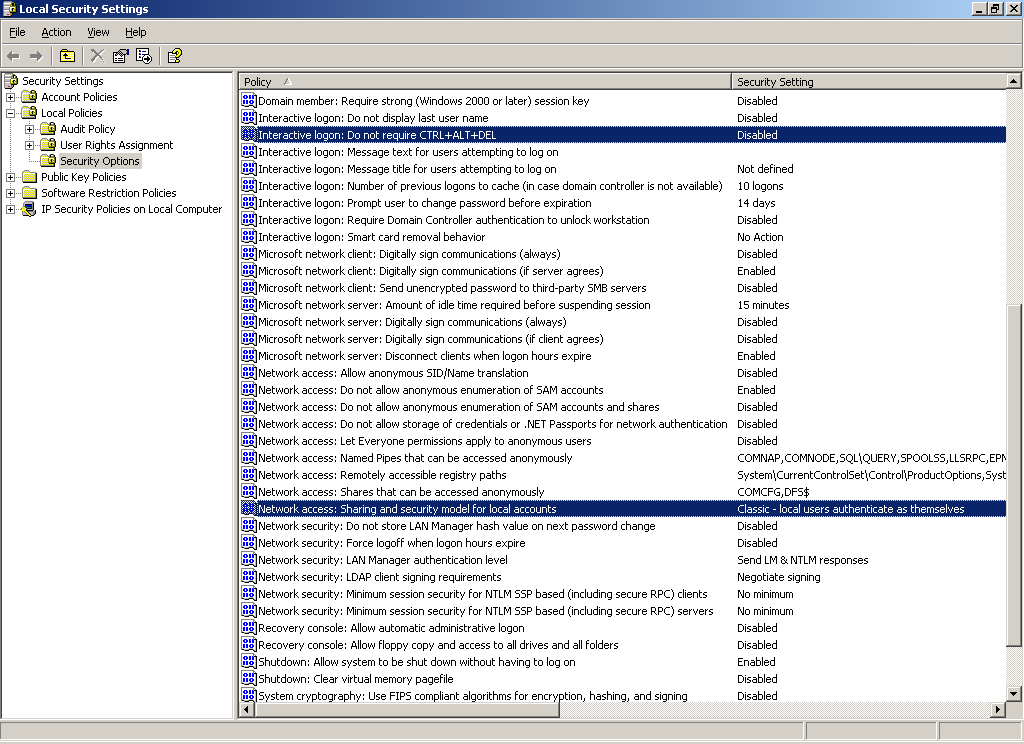So, here's how to do the per-user security thing. It's a secret, I guess, because it's not really documented. It also only works in XP Professional and not XP Home Edition. You have to go into Control Panel and select Administrative Tools, then Local Security Policy, and modify these Security Options (the two options are highlighted in the picture for clarity, but this is not possible in the actual window):