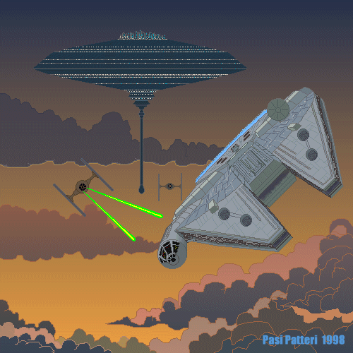 | CCbattle.gif | 62 K | Non-Animated. Two TIE Fighters chasing the Millenium Falcon with a backdrop of Cloud City. | 500 X 500. |