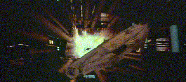 | falcon05.gif | 74 K | Non-Animated. Front view of Millenium Falcon when it is escaping from inside Death Star #2 after they have blown up the reactor and are being chased by the flames. | 638 X 282. |