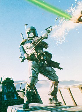 Meet Boba Fett, bounty hunter extrordinare.His real name is Jaster Mereel.His outfit is authentic Mandalorian armor, complete with helmet and a matched pair of wrist rockets.Mandalorian armor is rare and expensive, just like Fett. He commands top prices because only Han Solo ever escaped capture from the infamous hunter. He flies a heavily modified Firespray-class enforcer ship, the Slave 1. With his piloting skills, the Slave 1 is ready to track the next prey. This is a photo of Fett on the skiff barge as Jabba the Hutt tried to feed Han Solo, Chewbacca, and Luke to the Sarlacc. The nearly blind Solo hit Fett's jet pack with a spear and Fett slammed into the sail barge before plummeting into the Sarlacc's belly. Everyone thought he was dead but he blew up the sarlacc after about a week or two. The bounty hunter Dengar found him and nursed him back to health.