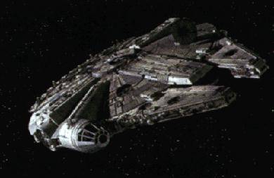 This is Han Solo and Chewbacca's legendary space freighter the Millenium Falcon. It has been their ship since Han won it off his buddy Lando Calrissian and a high stakes sabbac game on Cloud City.He also won enough money to make it into the ship of his dreams. The Falcon started out its life as a Corellian YT1300 stock freighter.Lando acquired it used(also in a sabbac match). The Falcon has two quad laser turrets, a concussion missle launcher, and military grade shields and jammers. But the most amazing thing is the Falcon's engines. It's sublight(for use in regular space) engines are very speedy. But it's hyperdrive engines steal the show. Its hyperdrive makes it point five past lightspeed. It is twice as fast in hyperspace as the fastest military ships! Han and Chewie have used it to get to some of the worst scrapes in history.