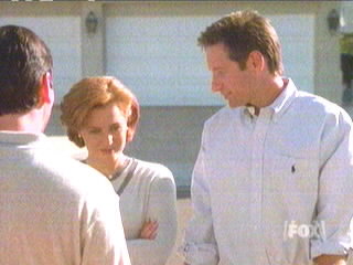 Escena anterior que tambien me gusto fue en la casa del señor Gogolak, bastante interesante el juego de manos que hicieron. Para Mulder era casi automatico el pensar que debia abrazar o tocar a Scully cuando estubiera con otros, para Scully, bueno aceptaba el hecho pero no le seguia el juego. En esta escena se lo siguio y cuando se dio cuenta de esto, quita su mano rapidamente. Mi unica explicacion a esto sigue siendo que todavia estaban muy recientes las palabras de One Son.