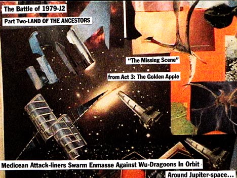 "Titanium ion-charge hulls of Medicean attack-fleet-liners had hummed the Jovian plane into an assortment of kill vectors on Saturnilian Wu Dragoon-Scooners. The Medicean Spread, ancestors of the people from Earth-Africa, had won that day over their rivals, the Halcyon of the Kingfisher, by sending Apollo-class warships and Hera-class command dreadnoughts into victorious battle against the Borneo Ringrider crafts modeled on Zhenghe the Awesome's '42 Light-year Fleet.'" "The prize that the Medicean Spread won that day in the last battle of the Knighthood Feuds was the ability to control life on every world in the Solar System, even if they wanted, on the planet Earth, and no more important than any other world." "The stress to my remembrance on that day was that all of the worlds that I had traveled through that had made up the Galilean satellites of Jupiter which had been corralled into the space battle by the Medicean Spread. The Halcyon of the Kingfisher, the knighthood from ringed Saturn, became the enemy of all of Jupiter that day. The political plottings of the Medicean Spread had culminated in the creation of the Notable Corporate Fiefs of Jupiter, made out of the result of the Secret Declension to the worlds of the Galilean satellites. The first trial-battle of the Gran'Notable Navies had all been represented that day for the great victory to drive the influence of the octogenarian Saturnilians out of home-system." | "Around Jupiter great destruction had occurred..." | |||||||||||||||||||