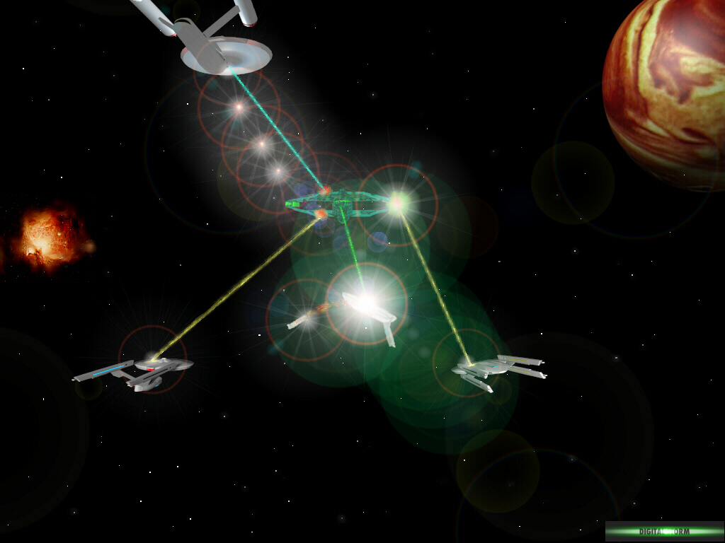 Hier seht ihr eine Schlacht zwischen 3 Föderationsschiffen und einem romulanischen Warbird