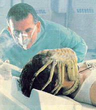 Egg The first stage is the egg, which are made mostly by a Queen. A ritual we've had for only the last few hundred years is the seeding of planets with eggs, in preperation for the Rite of Passage. The eggs are about three feet tall, and kept in a large chamber of the hive with the Queen. Carrier/Embryo Inside the egg is a creature with eight legs, and a strong prehensile tail, which searves as carrier for the embryo of a new Black Death. It latches onto a victim's face, then implants the embryo down its throat. The embryo grows inside the host, until it is big enough to survive on its own. During this time, it gathers information from the host's DNA, in order to better adapt to the host's envirionment. It uses the information to alter its growth, and inheirets certain key traits that the host possesed. This way, the deadlier the host, all the more deadlier the Black Death. When the embryo is ready to leave the host, it punches through its chest, killing the host. This is known in our toungue as "Z'skvy-de." It is against the rules to kill a Carrier attempting to pregnate a host, otherwise they're simply an annoyance.