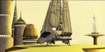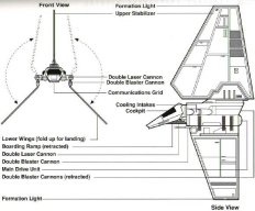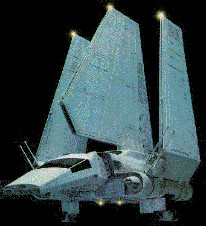 The Tyderian Shuttle (sometimes referred to as the "Imperial Shuttle") looks much like an inverted Y. The tri-wing assembly and large surface area make it excellent for atmospheric use even though it was designed for space travel. And while the large upper stabilizer is fixed and static, the port and starboard wings raise to a vertical position when landing and vise-versa when taking off. Boarding is made possible by a telescoping ramp that extends from the lower forward fuselage.
