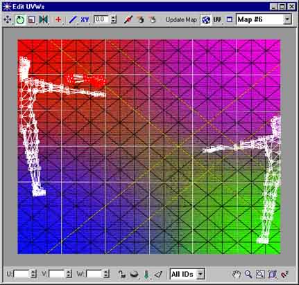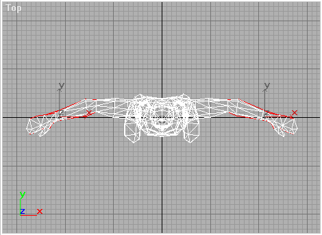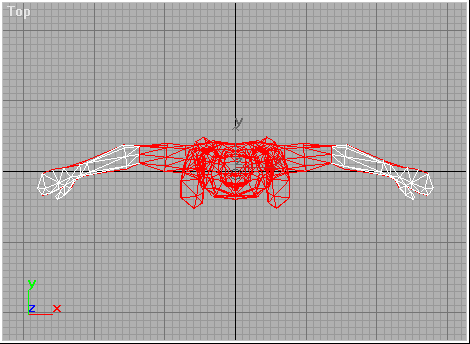 We need to look at where we can make faces run together, in an attempt to keep seams between pieces of texturing to a minimum. We cannot avoid seams altogether, but we can put them in places that are inconspicuous, like under the arms, top of the head and in places where the texturing can easily be matched ie. where the colour is uniform. We do this by working out which area's of our model can have texturing that wraps around. With our arm ideally the texturing will start from under the arm and wrap around the front, top, back and under the arm again. This way we'd have only one seam under one arm. Now we can work on the bottom of the arms. Collapse the stack and in Sub-Object Faces we'll get the previously selected faces. Again we go to the Edit menu and choose "Select Invert" to get: OK we end up with a lot of unnecessary faces selected, but it is easier to deselect most of these than to select the ones we want one at a time. Note: to deselect hold the Alt key down when you select.