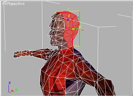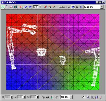Now to the back part of the head. There is a new little trick with mirrored Mapping coordinates to be learned here. By using Editable Mesh Sub-Object Face with "Ignore backface" OFF, you can select all of the sides, top and back of the head in one go then Apply a New UVW Map modifier. Note: remember to collapse the stack between each stage or when ever you need an Editable Mesh.