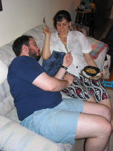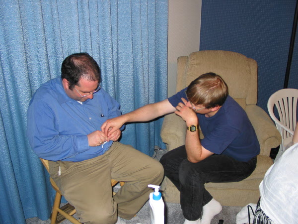 Last year Rachel showed everyone a little game that involved grabbing your right ear with your right hand, your nose with your left hand with the left elbow over (around) your right elbow, then trying to pull your right hand all the way through your left arm without letting go of your nose. We got some hilarious photos of people contorting themselves, trying to make this happen. See the 2001 directory, if you don't know what we mean, or, better yet, get Rachel to show you, hehehe.