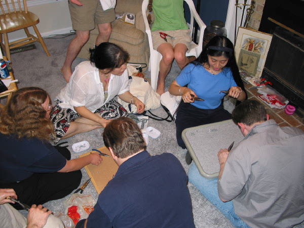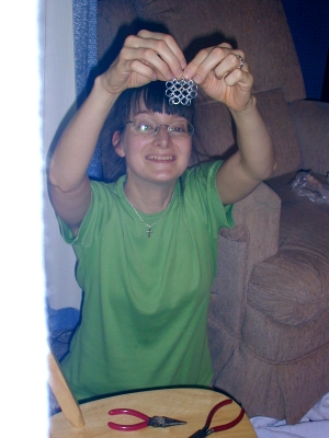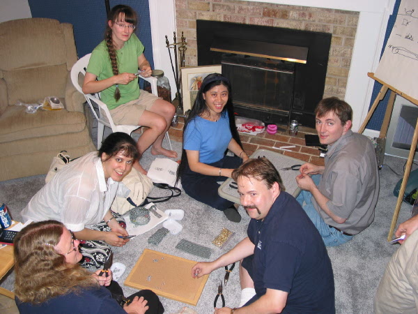 Alexis challenged everyone to try their hand at chainmail. With just a bit of wire, a plastic coat hanger, tin snips, two pairs of pliers, and a handy dandy diagram, you too can make your very own chainmail! After several hours, people were happy to have a small square of chainmail to show for their efforts (see John's picture of Laura). Well, at least everyone's nose can be protected!!