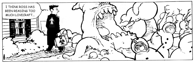 Here's a little literary humor. It was originally a "Calvin and Hobbes" comic strip, but it has been changed to protect the innocent. The "Ross" refered to in it is my friend Ross (Dark Horse), who shares the same love of Lovecraft's work that I do.