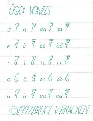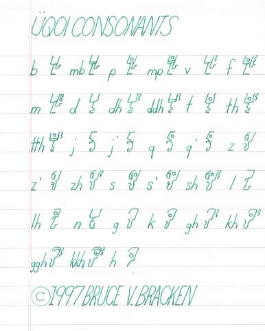 These are examples of Mbö'özhiizhiighukhamno Üqoi, The Üqoi Alphabet. The first is the handwritten form: