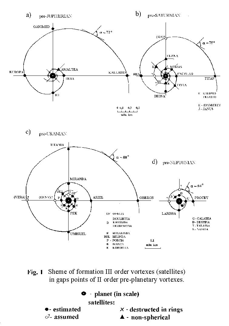 1. All satellite systems of planets, as well as the Solar system, are formed from two- branch pre-planetary (pre-Solar) vortexes. 2. Series of radiuses values satellites (planets ) regular orbits each of satellites ( Solar ) # systems represent geometrical progressions, denominators of which ( the factors of system ) in accordance with the rule decrease from 1,8191 ( external circuit of pre-Solar spiral ) up to 1,175 ( external circuit of pre-Neptune ) while orbits become farther away Solar centre. 3. Angle a of pre-planetary vortexes logarithmic spirals in accordance with the rule increase from 69°,as a round value,( pre-Solar ) up to 84° ( pre-Neptunian) while the vortexes become farther from centre of pre-Solar one. 4. At each satellite system there is the limit, described by boundary values of main parameters (a =90°, Z=1 ), over which only irregular satellites rotate, formed not on occupied by them today orbit ( the Moon, Fobos, Deymos, Haron, Triton and other are those). 5. The rings from dust and wrecks around planets, having the similarity (in compound and in commonality of structure) with so-called "asteroid zone" around the Sun , represent the destruction product of satellites-antipodes pairs formed originally on opposite branches of pre-planetary vortexes spirals as well. 6. On “unoccupied" (by satellites ) regular planet-centrical orbits the opening of new satellites is possible. The list of these orbits, established on the basis of calculations offered here, on which satellites or their wrecks are not found yet , is perfomed in table 5. table 5