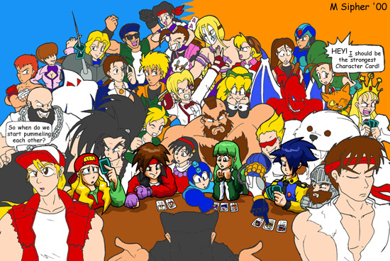 I entered this one in SNK's second SNK Vs. Capcom illustration contest... even though I'd started on it for the first one. I didn't get as many characters in as I wanted to, as I managed to catch the flu during the final week of the contest, and had to force myself to finish it in time. That's also the original reason why the characters who aren't actually playing card don't have shading...