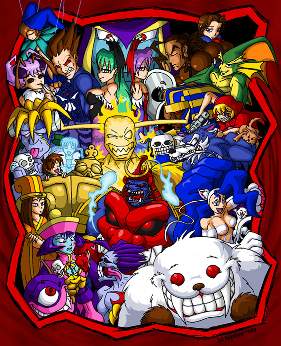Capcom's wicked little fighting game series. This pic has the main cast from DS3, plus the hidden "characters" Shadow and Marionette... I wanted to include the woodsmen who help out B.B. Hood and the other catwomen from Felecia's "Please Help Me"... but I was kinda cramped for space as it was. |