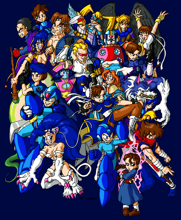 It started as just a drawing of RockMan, Felicia, X & Chun-Li... then I noticed that blue featured heavily in their color schemes. Then I thought about the OTHER Capcom characters that were predominantly blue... |