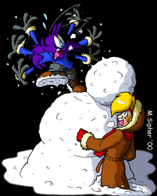 There was actually a "snowman" in the neighborhood about as tall as the one in this picture. Well, I suppose it was intended to be a snowman... it sounds better than "great damn tall lump of snow". Of course, we were in 80+ weather bythe time I replaced the graphic... |