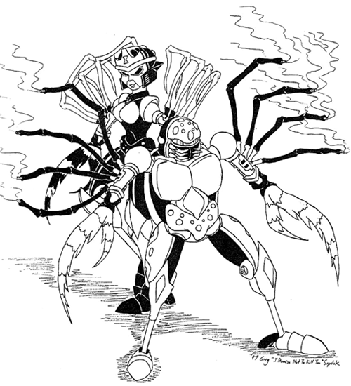 Cover of Con-Quest again. Always happy to do 'em. I've liked Tarantulas since the every first episode of Beast Wars, since he's always been portrayed as a sick, twisted, sadistic, giggling psychotic. Those kinds of characters are always entertaining. And Blackarachnia's a very intersting character, through all her changes. And I gotta say, I rather like how she looks in Beast Machines. |