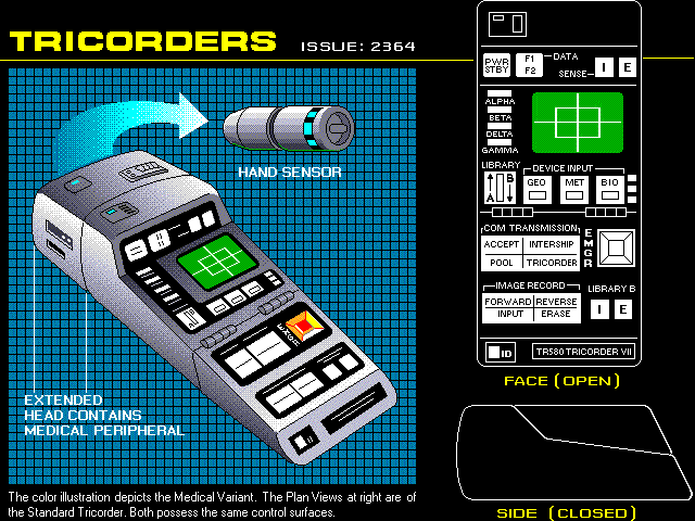 ![]() The medical tricorder consists of a standard tricorder, to which is added a specialized medical peripheral device (MP). This peripheral, one of a number of dedicated auxiliary computing options available to Starfleet crews, adds many powerful sensor and analysis functions to those used by sickbay personnel onboard the ship.