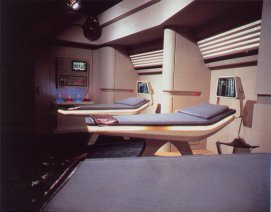 ![]() Medical care facility aboard starships and most starbases. They usually have their own intensive care unites, doctor's office, medical laboratory, an OB/GYN unit, examination room, and rehabilitation equipment. For those ships having families aboard, there will also be a nursery. Normally, there are at least 2 surgery suites, a physical therapy unit, a dental care office, and a full biohazard isolation unit. On most starships, at least 4 medical personnel are on duty at all times. In large scale disaster situations, sickbay faciltities can be supplemented by converting the shuttlebays into emergency triage and treatment centers. This area of the ship is the prime responsibility of the chief medical officer.