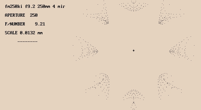 Current version of my design DATA: fm250ki f9.2 250mm 4 mir UNITS ARE mm, DEGREES, AND WAVES FOR COMA AND LINE COMA Surface: R-sag, Spacing, Tilt angle, Conic constant, R-tan, Coma, Line coma 1 -4935.001 -1200.000 +5.37 -0.86 -4935.001 +0.00 +0.00 2 -6350.000 +800.000 -17.36 +0.00 -6350.000 +0.00 +0.00 3 -6350.000 -312.500 -13.00 +0.00 -6350.000 +0.00 +0.00 4 +4424.649 +481.053 -20.01 +0.00 +4424.649 +0.00 +0.00 TRANSVERSE RAY ABERRATIONS: fm250ki f9.2 250mm 4 mir In Airy disk diameter (AD) units: 0.013198 mm ON-AXIS ASTIGMATISM, COMA, AND LINE COMA: -0.16 +0.02 -0.02 SPHERICAL, COMA, ASTIGMATISM, AND PETZVAL FIELD CURVATURE: -0.24 -1.08 +0.40 -0.35 SAGITTAL, TANGENTIAL, DIFFERENCE, AND MEDIAL IMAGE PLANE TILTS: -0.59 +0.38 -0.96 -0.10 DEGREES ANAMORPHIC DISTORTION: -2.35 PERCENT SPECIFICATIONS FOR SYSTEM fm250ki f9.2 250mm 4 mir F/NUMBER 9.21 APERTURE 250.00 mm FOCAL LENGTH 2301.44 mm IMAGE DIAMETER 20.08 mm FIELD OF VIEW 0.50 DEGREES DISTORTION: fm250ki f9.2 250mm 4 mir ANAMORPHIC -2.35 % ECCENTRIC -0.00 % KEYSTONE +0.11 % BARREL/PINCUSHION -0.00 % AT MEDIAL SURFACE TILTED -0.10 DEGREES CLEAR APERTURES FOR SYSTEM fm250ki f9.2 250mm 4 mir MIRROR CLEAR APERTURE IN mm 1 250.0000 2 145.4764 3 101.4940 4 78.5116