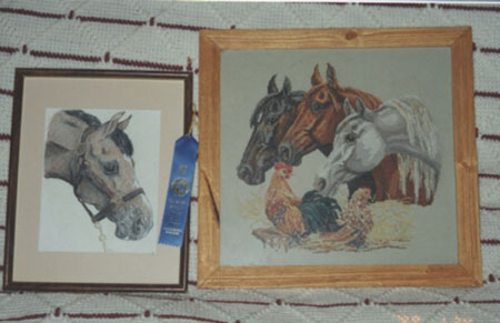 I have been doing cross stitch for over 15 years now. The cross stitch one the right is called "Evening Gathering*. The colored pencil drawing on the left in one I entered in the fair up in Fairbanks Alaska and won a blue ribbon for it.
