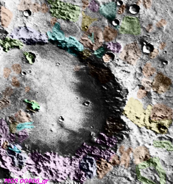 The large object in the center of the crater colored green confoms closely to the form of numerous spacecraft located in space images, and may prove to be another example of the very same. Two other familiar recognizable spacecraft forms are shown in blue leading down to lower left from the one centered in the crater, and another seems to be obscuring a Cydonia-like face near center at toward the top of the image.