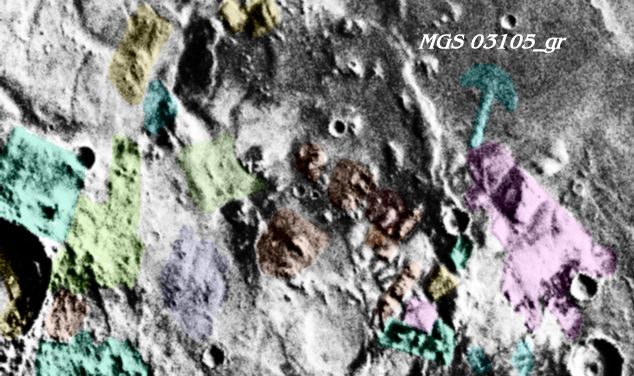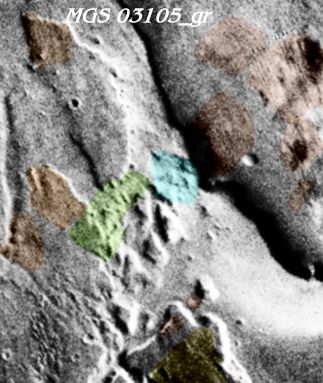 The notion that this image contains depictions of "the three bears" (in brown) becomes appreciably less whimsical when it is noted that the contoured area at the bottom might contain two more bear heads facing left. Even less whimsical is the fact that on the right side of this excerpt from the source image, a whole set of Cydonia-like faces can be detected, the most expressive being also the most prominent one occupying center.