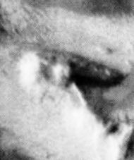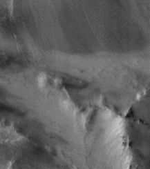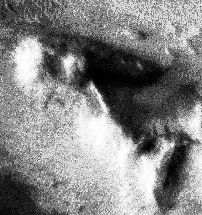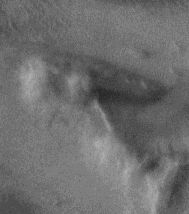 This is MGS 06304b, shown at 1/4 original size. At right is more of a close-up of the area we are most interested in. As you can see, it has an intriguing form, a "v" shape, that's reminiscent of "heads" found so many times before in extraterrestial image data, seeming to fall into three categories- all of them popular ancient Egyptian animal motifs- bats, bulls, and the jackal-head of Anubis.