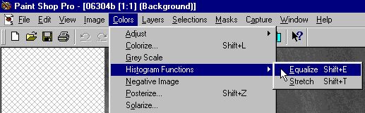 At right, is a screen capture of the Paint Shop Pro window as I am using it, showing to access the the histogram equalization function that is used to create a better constrast for viewing certain objects.