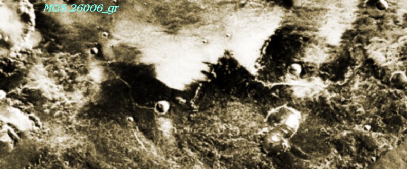 This image of an area in Southern Sinus Meridiani (Sinus Meridiani is of course home to kksamuria's amazing New Face on Mars at Meridiani, and a great many other anomalies as well). Here is a collection of unindicated strange but somewhat undeteriminable forms, clipped from the source image which contains other possibilities such as the possible pyramids near center on the left border of the original. The right side of this segment is particularly rich in the suggestions of huge enclosures that once contained vast ancient cities, yet such evidence of deliberate structure is all throughout this clip, and particularly striking when we consider the angularity of the dark areas in the image.