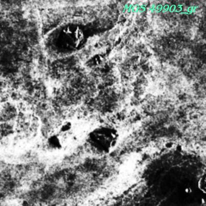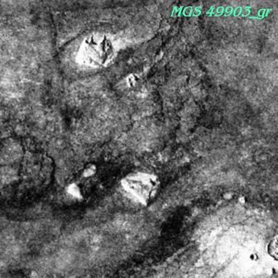 Here, and repeated in negative below, are several strange looking objects... the higher one resembles some sort of temple or castle, and the lower outstanding object greatly resembles a pyramid view from a skewed angle.