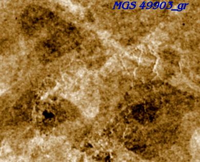 This colorized clip from the same source image shows a pentagonal enclosure bisected by some possibly natural feature running through it... looking closely, it appears to be twopentagons fused together, each with an open side, and a pyramidal or prismatoid form at the close side of their juncture. Keen-eyed observers may also find even more odd things in this image...