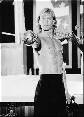 be 6'5) blonde man, wearing an open billowing white shirt, black pants, and