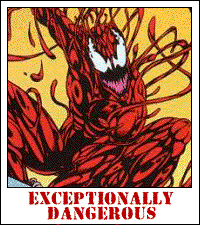 Powers: Has a symbiote costume simalar to Venom, but seems to be more powerful, possibely due to it's incubation on Earth. Kasady's symbiote can, like Venom's, mimic any type of clothing, but unlike Venom, Carnage has not been seen useing the costume as camoflage. The symbiote has augmented all of Kasady's physical abilities to super-human levels apparently higher than that of Venom's.