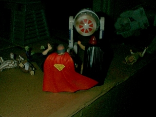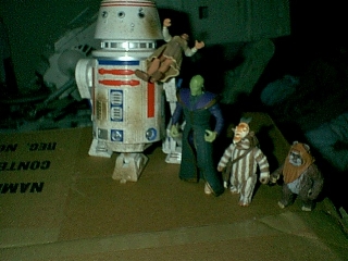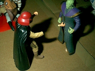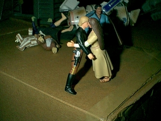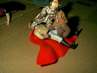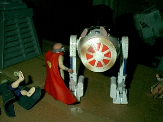 Nice day, eh? Yeah, compared to Tatooine any day is nice. | Helllllp! Helllllp! | Oh, no! It looks as if Dr. X has kidnapped Leia again. We need to help her. No, not us but rather. . . | Captain Suave and Wormie | Go get Dr. X! I'll keep his henchmen distracted | You'll never stop me Wormie! Think again Dr.! Nobody can take a hit from my flying Robo Jedi Rocket Hand and be able to talk about it! | That was easy enough Wormie, but what about that droid? He's going into MISSILE FIRING mode! Stand back. I'll Handle this | You're doing it Wormie, you're wearing it down | My hero! Oh yeah! |