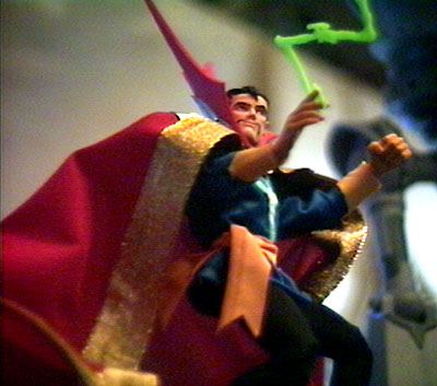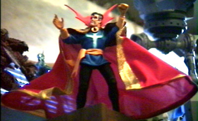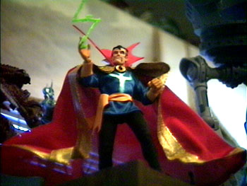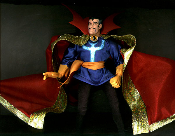 Ok, I FINALLY broke down and invested in a sewing machine.. and the cash really did pay off! The good Dr. Here has a completely removable costume., with snaps, (the cloak of leviatation as well), and even the Eye Of Agamotto is removable! There's some innovative stuff here as well. The material in his shirt and cape both have some "ribbing" to them,makeing them look quite nice. The eye of agamotto is a doll cat's eye, placed into a fancy gold chromed button. His shirt emblem is another of my Photshop stickers. I don't know how well it shows up, but rather then a plain light blue, it has a mystical looking pattern I put into it. His belt has yellow lycra, but is now orange.. I used acrylic paint to "die" it, and let it dry nonflat. So where it indents, there are darker orange shadowing! Then there's his cape..