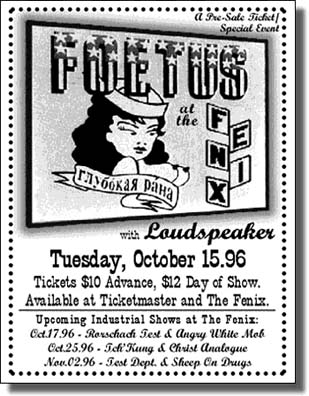Yet again, I did this with PhotoShop and Quark XPress. I got the billboard with the chick on it from the Foetus album, GASH. I used a font called Placecard for the part where it says "Fenix" and a font called Circus for the dates and other info. I was going for a kind of circus sideshow poster sort of feel. Of course, I can only dream of ever doing anything that cool. I love the look of the old show bills and stuff from the '20s-'40s. That's how I was going to do The Infamous Herr Fickelgruber's Freakzine, but that was pretty shortlived due to financial constraints. In fact, I never even got the first issue printed. It's all laid out and ready to go, but I decided to just go with the webzine thing, and do Mainline instead. |